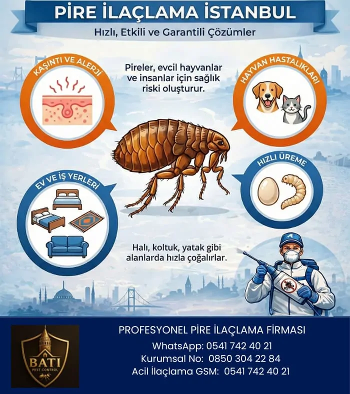 Evde, iş yerinde veya bahçede aniden beliren pireler, sadece kaşıntı ve rahatsızlık vermekle kalmaz, aynı zamanda ciddi bir sağlık sorununun da habercisi olabilir. Bu minik canlılar, inanılmaz hızlı ürerler ve kısa sürede tüm yaşam alanınızı istila edebilirler. Peki, bu dertten kurtulmanın en kesin ve kalıcı yolu nedir? Profesyonel pire ilaçlama hizmeti! Batı Böcek İlaçlama olarak, İstanbul pire ilaçlama konusunda uzman ekibimiz, Sağlık Bakanlığı onaylı ürünlerimiz ve %100 müşteri memnuniyeti odaklı hizmet anlayışımızla size özel çözümler sunuyoruz. Amacımız, pire sorununuzu kökünden çözerken, sizin ve sevdiklerinizin sağlığını korumak ve yaşam alanlarınızı huzurlu bir hale getirmektir.